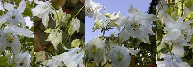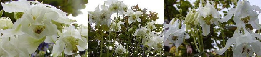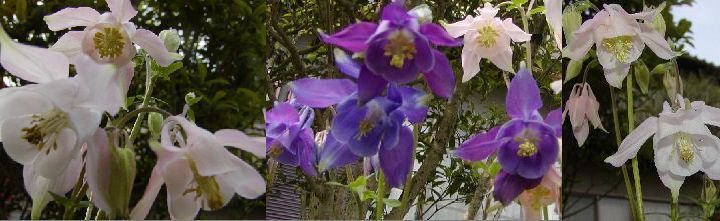 | 西洋オダマキのみんな〜 ※その12は、白系の子です。これで最後のシリーズにします。 ページを占領して、すみませんでした。左)は、中の子のアップ 白が綺麗ですよ。薄ブルーの子もいます。 |