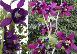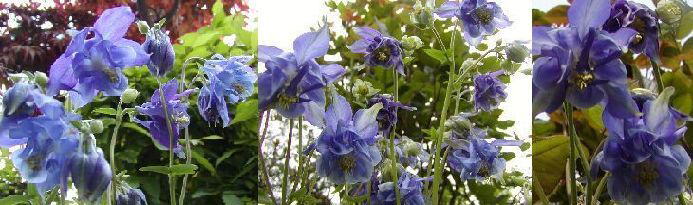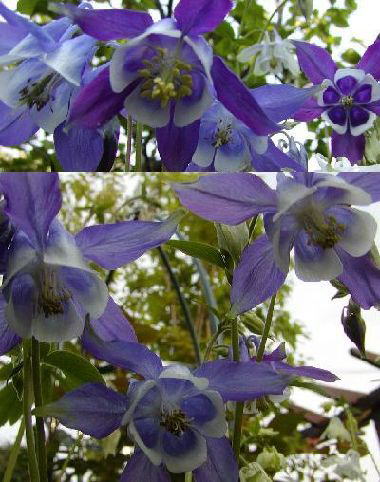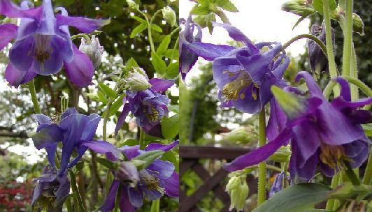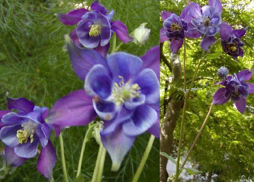 | 西洋オダマキのみんな〜 ※その7は、紫系に中ブルーの子です。右)は、一本の中から・・・ シングルとダブル咲きの子が、出ました。「西洋オダマキ」一つにしても、こうして観察していると不思議です。 |