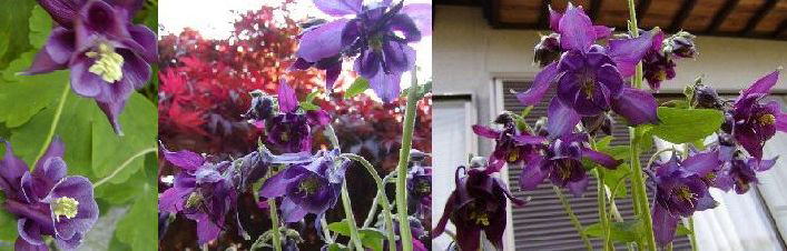 | 西洋オダマキのみんな〜 ※その10は、紫系の子です。赤紫の子(あずき色の子って、感じかな・・・?)もいれば 黒っぽい子もいます。背高のっぽになったので、風のある日は心配でした。今は支柱があるので、安心です。 |